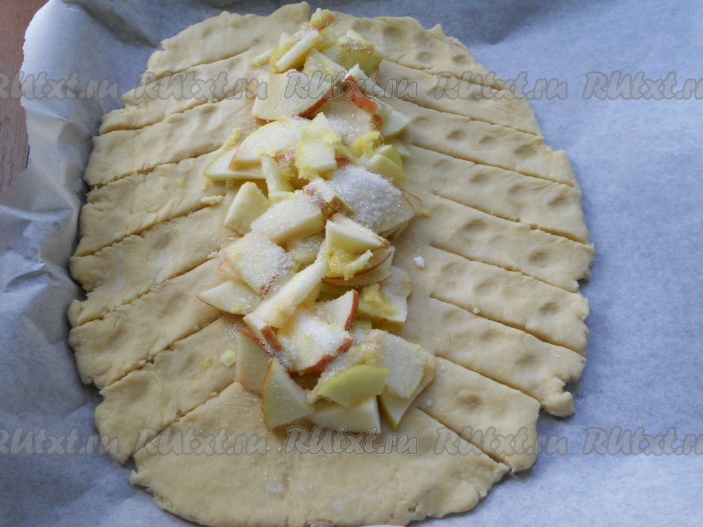 Также яблоки посыпать сверху 2 столовыми ложками сахара. С двух сторон теста сделать разрезы, начиная от яблок и заканчивая краями.