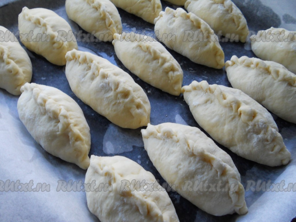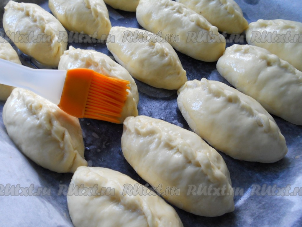 Желток соединить с молоком. Оставить пирожки, прикрыв полотенцем, в тёплом месте на 30 минут, после чего смазать каждый пирожок смесью желтка и молока.