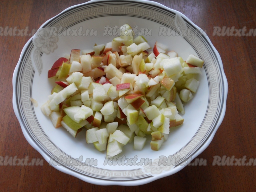 Яблоки очистить от семян и нарезать на маленькие кубики (очищать яблоки от кожуры я не стала).