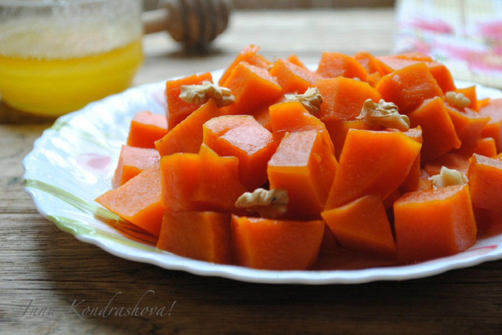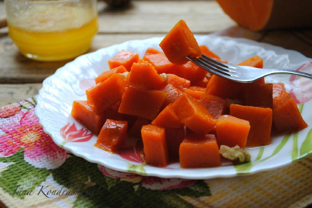 Хочу поделиться рецептом вкусного и полезного блюда. Тыква с мёдом, запеченная кусочками в духовке, придется по вкусу не только взрослым, но и деткам. После запекания тыква не потеряет свою форму, за счёт гвоздики и мёда приобретёт сладкий вкус и приятный аромат. Попробуйте!