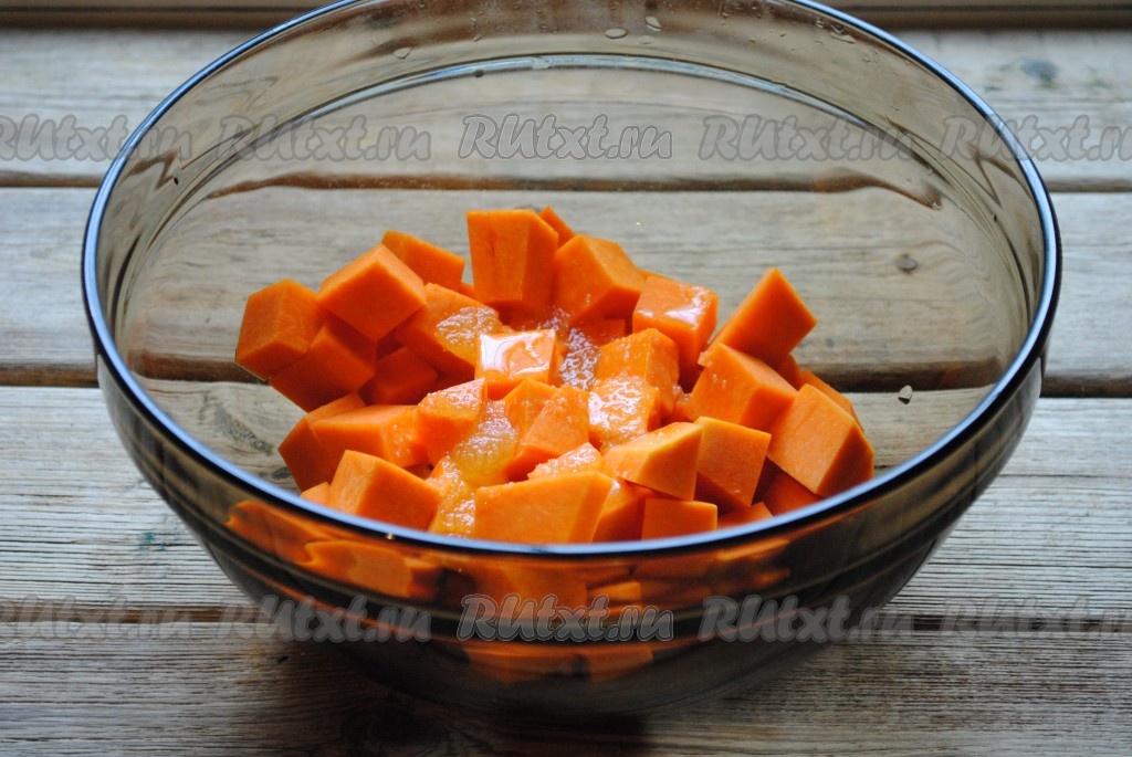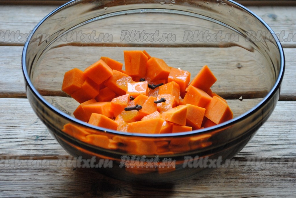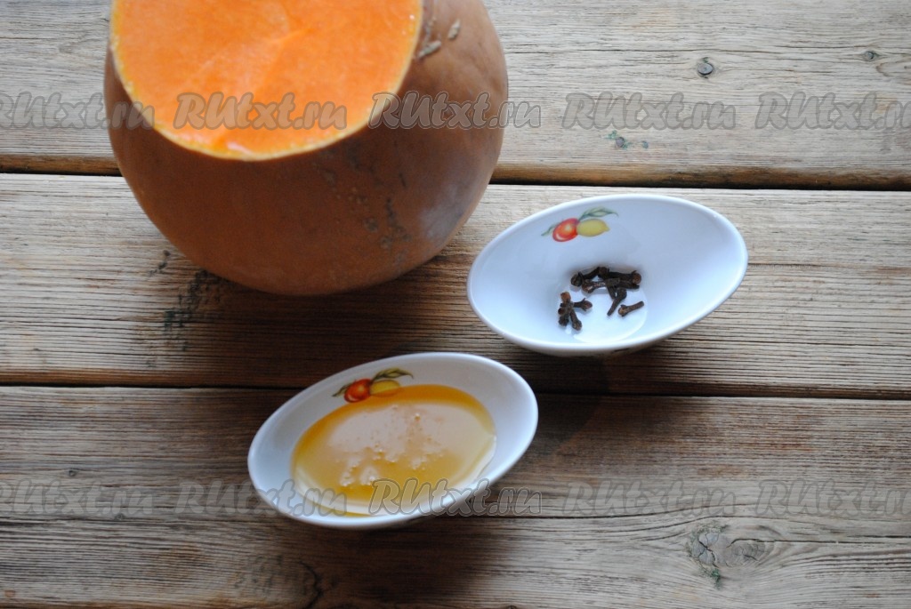 и веточки гвоздики. Перемешать и отправить на 1 час в прохладное место. За это время нужно несколько раз тыкву перемешивать, чтобы кусочки равномерно пропитались мёдом.