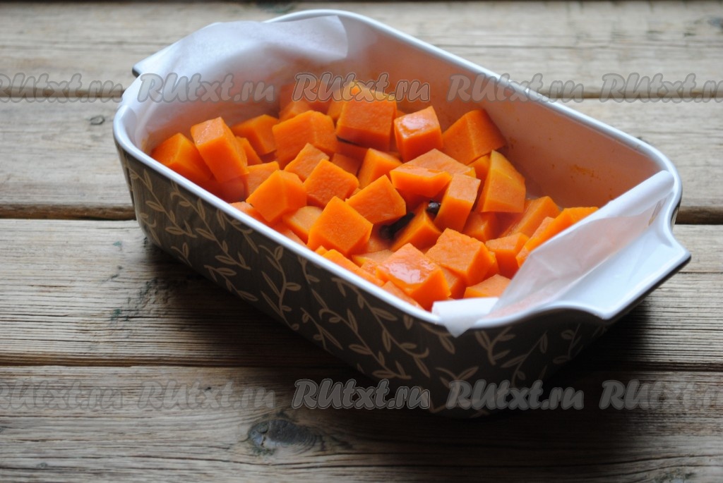 Жаропрочную форму застелить пергаментом и выложить подготовленную тыкву.