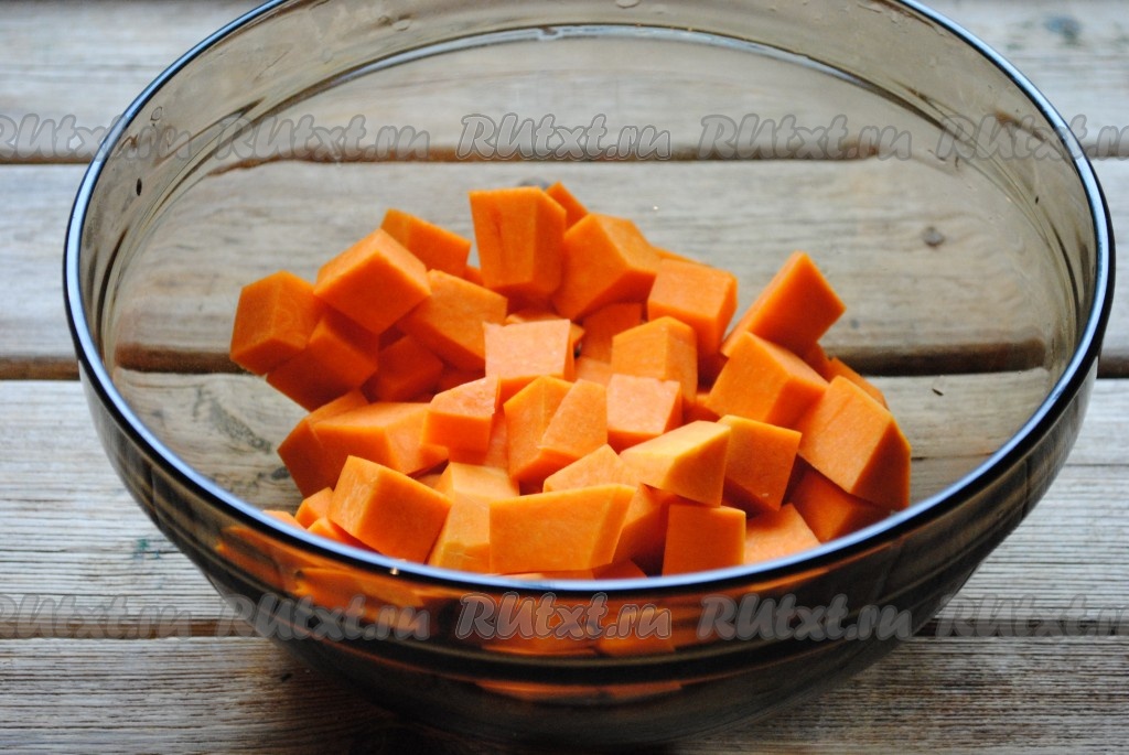 Тыкву очистить от кожуры и семян, вымыть и нарезать кубиками среднего размера. Я использовала тыкву сорта "Мускатная", она продолговатой формы и семена находятся только с одного края, всё остальное - это оранжевая, сочная, сладкая и ароматная мякоть, из которой можно приготовить массу полезных и вкусных блюд.