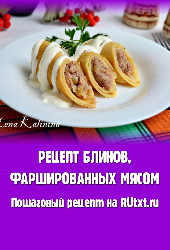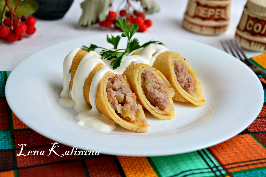 Блины, фаршированные мясом, приготовленные по этому рецепту, получаются очень вкусными. К столу подаём в теплом виде со сметаной. Еще можно блинчики перед подачей обжарить на сливочном масле - они станут еще вкуснее!