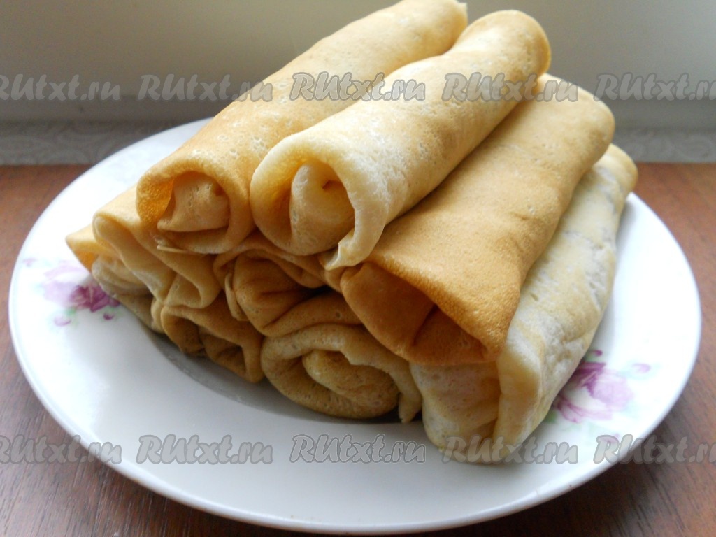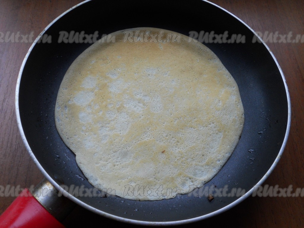 Жарить блины обычным способом: на хорошо разогретую сковороду наливать небольшое количество теста и жарить каждый блинчик до румяного цвета с двух сторон. Для первого блинчика смажьте сковороду растительным маслом, затем жарьте блины на сухой сковороде.