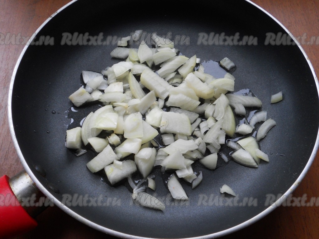 Лук репчатый нарезать и поместить в сковороду. Влить растительное масло.