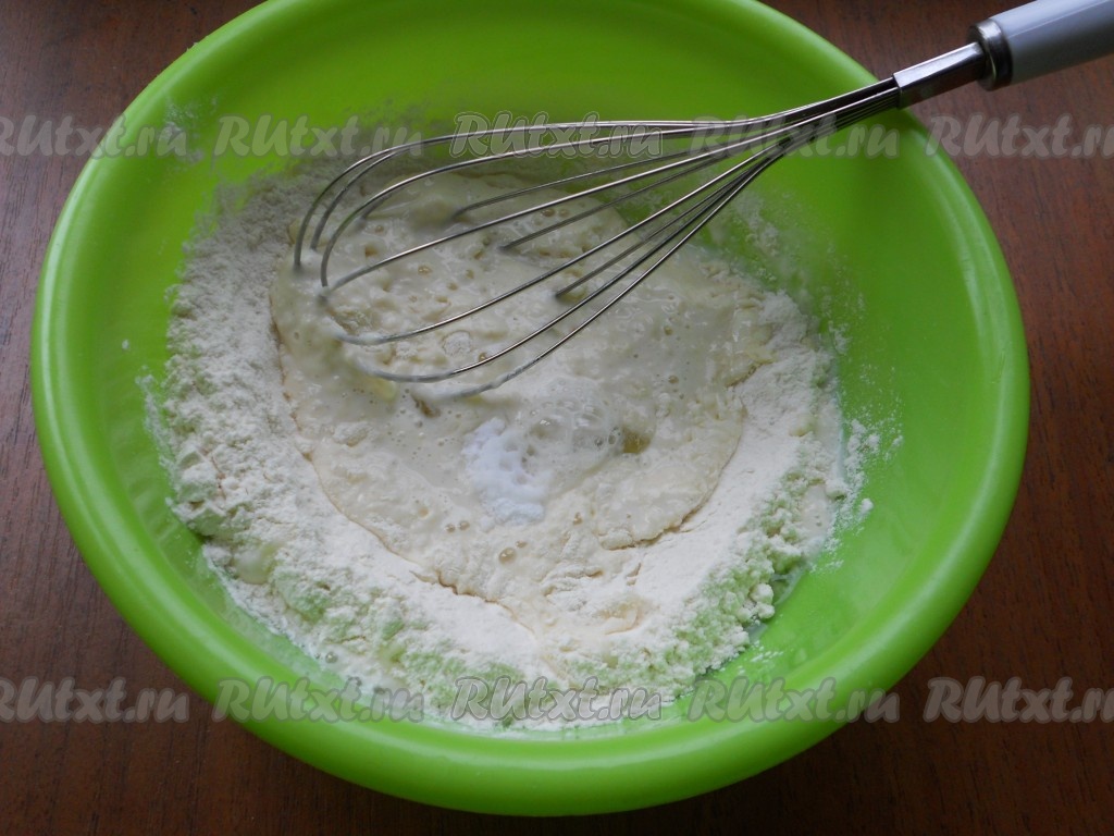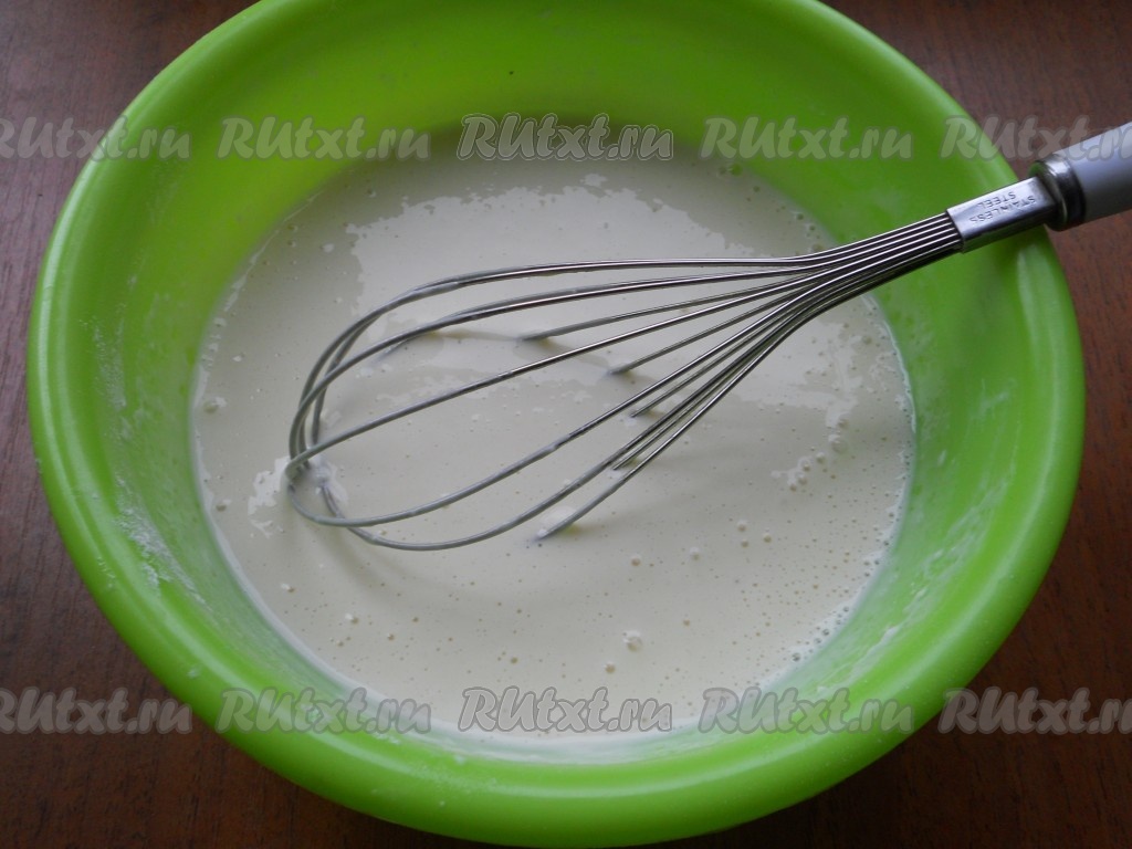Воду смешать с молоком и вливать в получившуюся мучную смесь частями, замешивая венчиком тесто. Также добавить соду, гашеную уксусом или лимонным соком.
