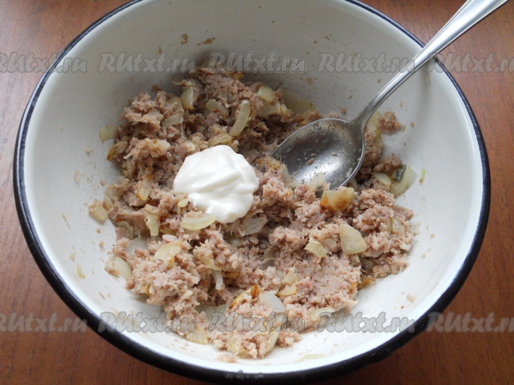 Добавить майонез к мясу с луком и тщательно перемешать начинку для блинчиков.