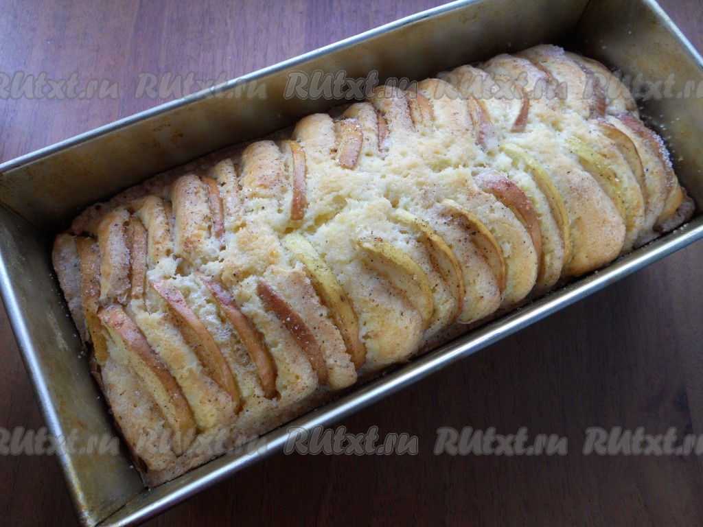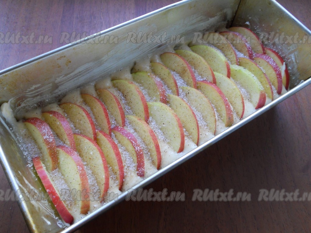 Бока формы для кекса смазать сливочным маслом, дно застелить пергаментом. Выложить тесто в форму размером 25х11 см. Яблоки нарезать тонкими дольками и разместить их вертикально по верху теста. Посыпать яблоки сахаром с корицей.
