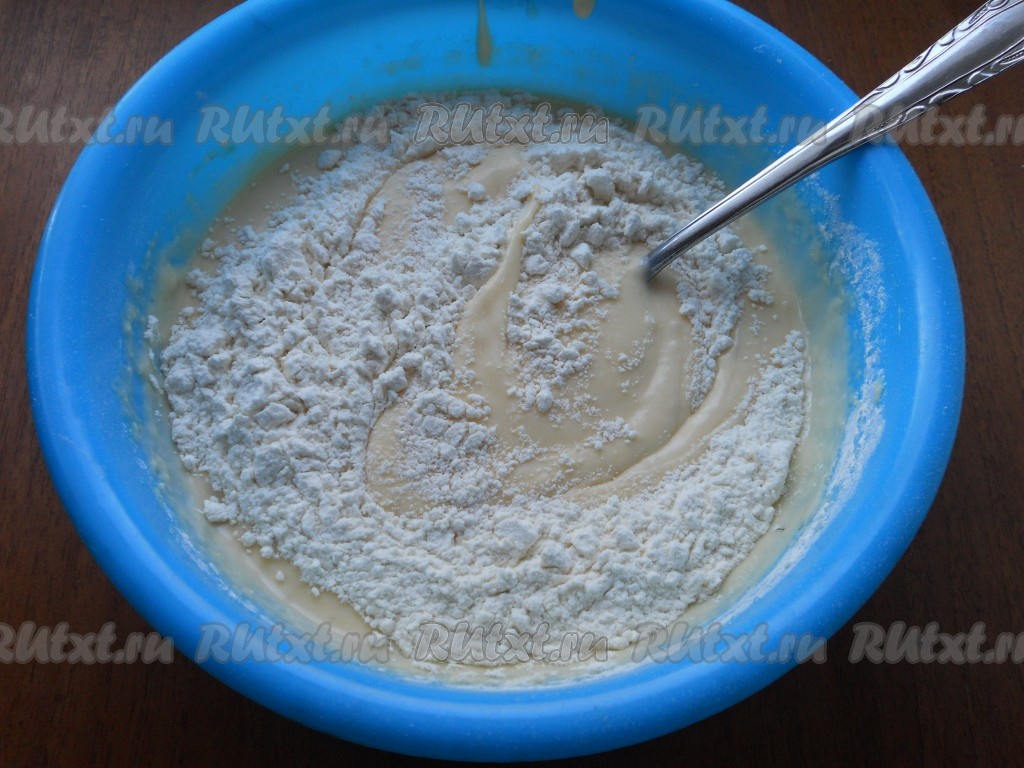 Всыпать половину просеянной с разрыхлителем муки, тщательно перемешать тесто.