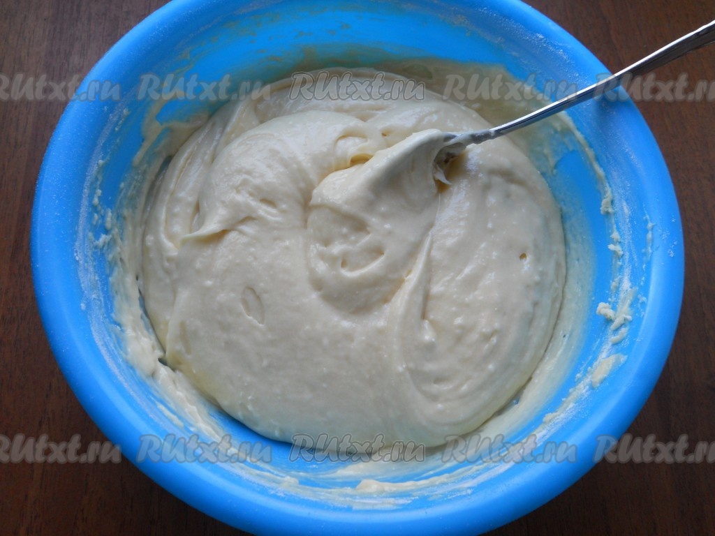 Затем всыпать оставшуюся муку с разрыхлителем и замесить очень нежное, похожее на крем тесто.