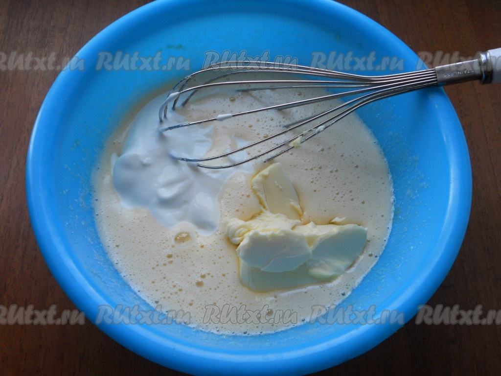 Добавить в яичную смесь сметану и размягченное сливочное масло, перемешать вначале венчиком, а затем - погружным блендером до однородного состояния.