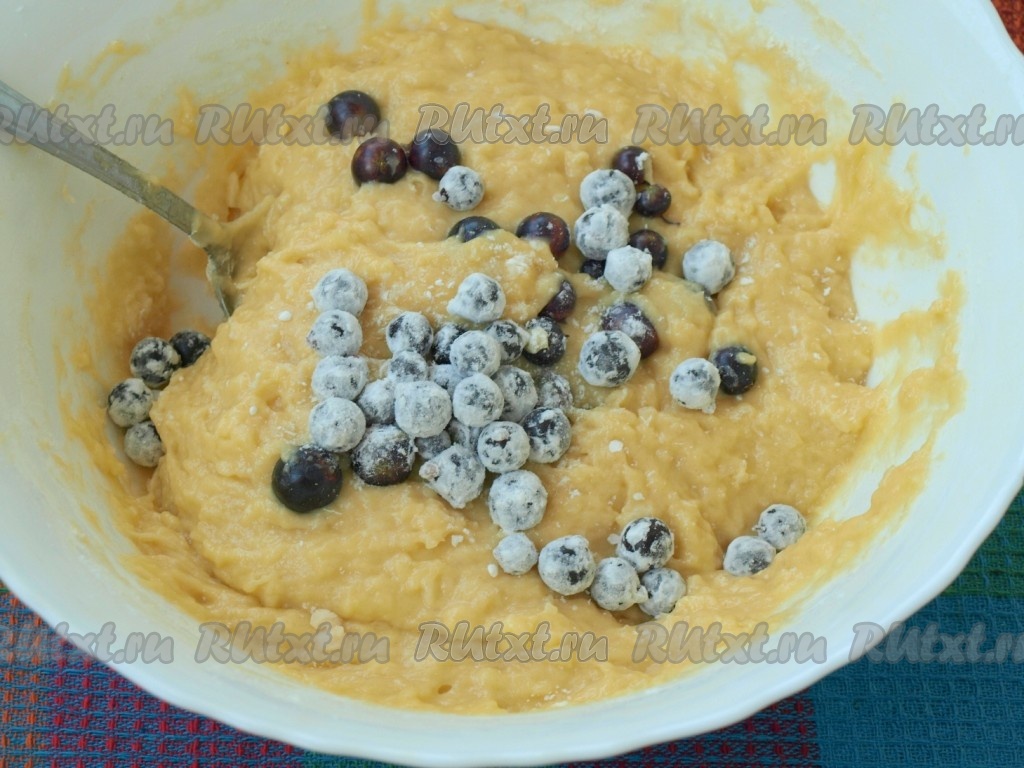 Ягоды присыпать крахмалом, добавить их в тесто. Если вас не смущает тот факт, что ягоды окрашивают тесто, крахмал можно не добавлять.
