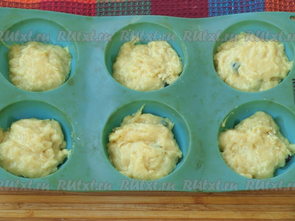 Тесто разложить в силиконовые формочки, заполняя на 2/3 объёма.