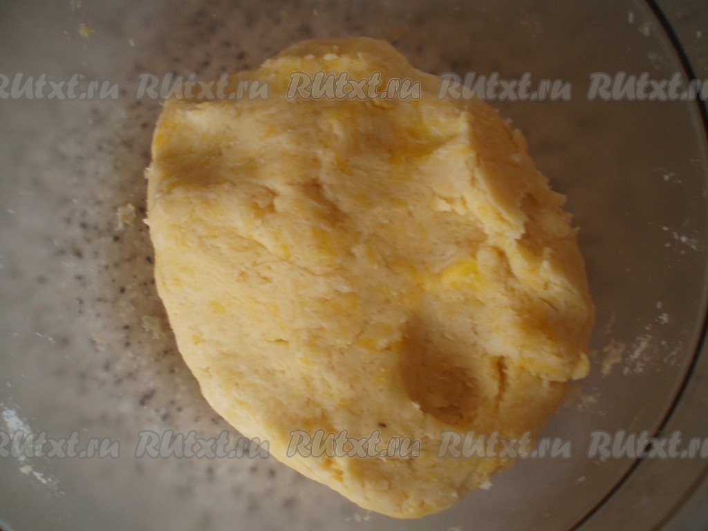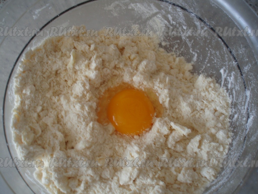 Муку и сахарную пудру просеять со щепоткой соли в глубокую миску. Добавить кусочки холодного сливочного масла (или маргарина), перетереть руками до образования крошки. Добавить 1 яичный желток.