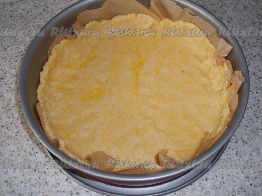 Охлаждённое тесто раскатать и выложить в форму для выпечки, формируя бортики (при желании форму для выпечки можно застелить пекарской бумагой).