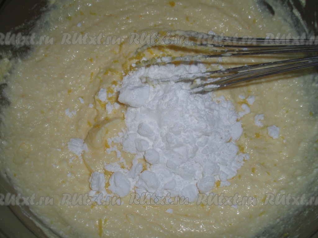 Затем в яичную смесь добавить протёртый через сито творог, сметану, крахмал и лимонную цедру, перемешать получившуюся творожную начинку до однородности.