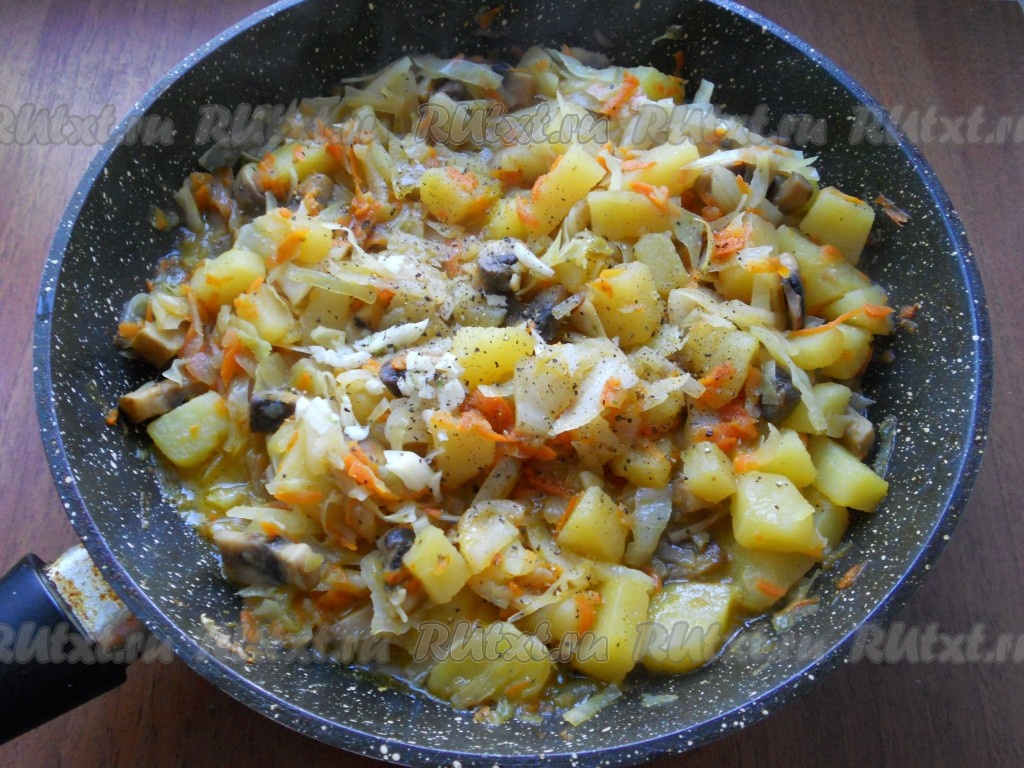 Все перемешать, влить бульон. Тушить капусту с грибами и картошкой на слабом огне, периодически перемешивая, минут 15 под прикрытой крышкой. Далее добавить нарезанный чеснок, если нужно - досолить и немного еще поперчить. Подержать сковороду на огне 3-5 минут и выключить газ.