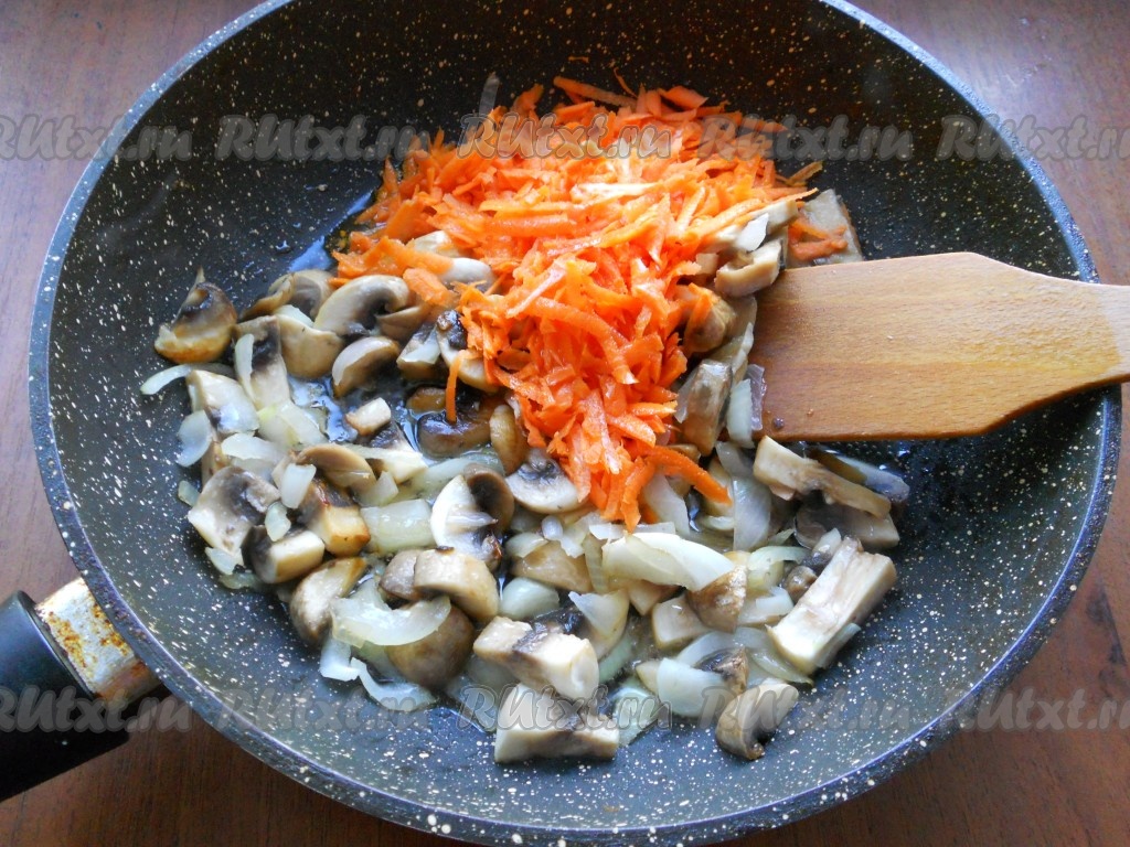 Обжарить лук с грибами, иногда помешивая, до небольшой румяности, затем добавить натертую морковь.