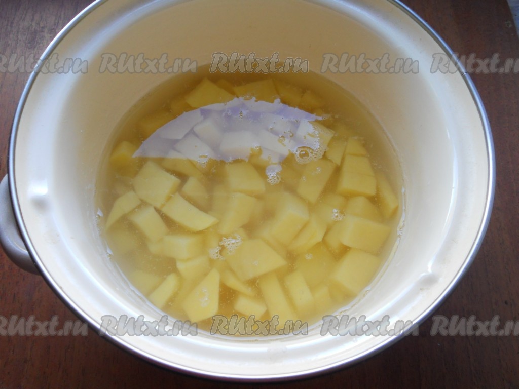 Картофель очистить, нарезать кубиками, поместить в кастрюлю, залить водой. Отварить картофель, подсолив воду, минут 10, после чего воду слить.
