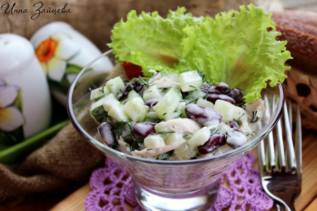 Аппетитный, питательный, вкусный салат из курицы с фасолью и огурцами готов.