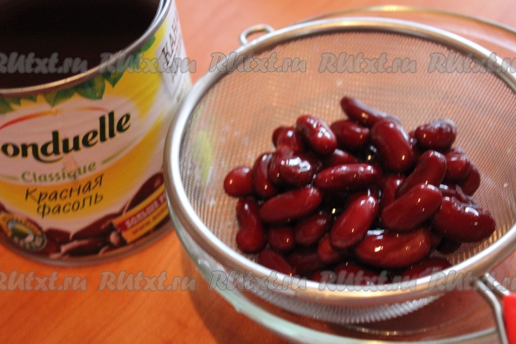Переложить фасоль из банки в сито и дать стечь лишней жидкости.