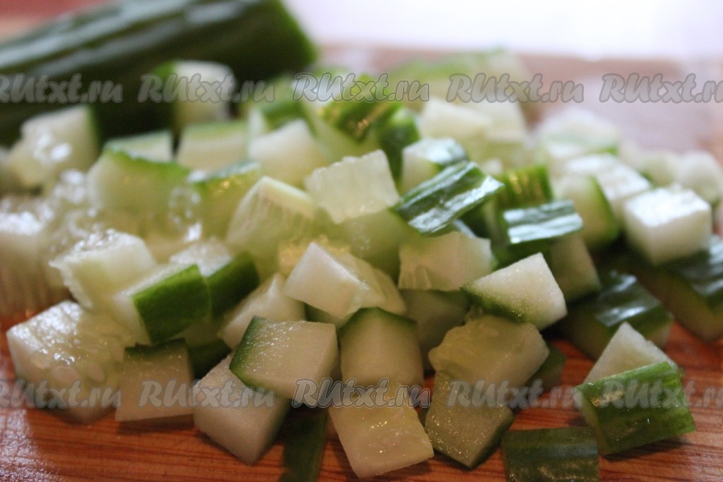 Свежий огурец вымыть и нарезать небольшими кубиками.