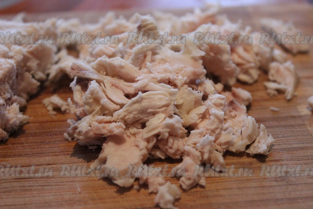 Куриное филе вымыть, выложить в кастрюлю, залить холодной водой, довести на сильном огне до кипения, посолить и варить на небольшом огне, примерно, 15-20 минут (до готовности), затем остудить, разобрать на волокна или нарезать небольшими брусочками.