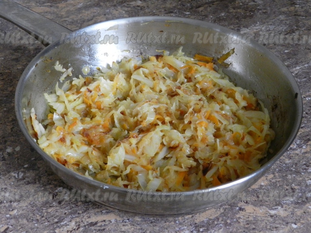Уменьшить огонь, накрыть сковороду крышкой и тушить капусту до мягкости (примерно минут 15-20 минут), иногда помешивая. Воду или другую жидкость старайтесь не добавлять. В процессе тушения посолить и поперчить овощи по вкусу. После того как капуста станет мягкой, убрать сковороду с огня, дать овощам остыть и начинка для картофельных зраз готова.