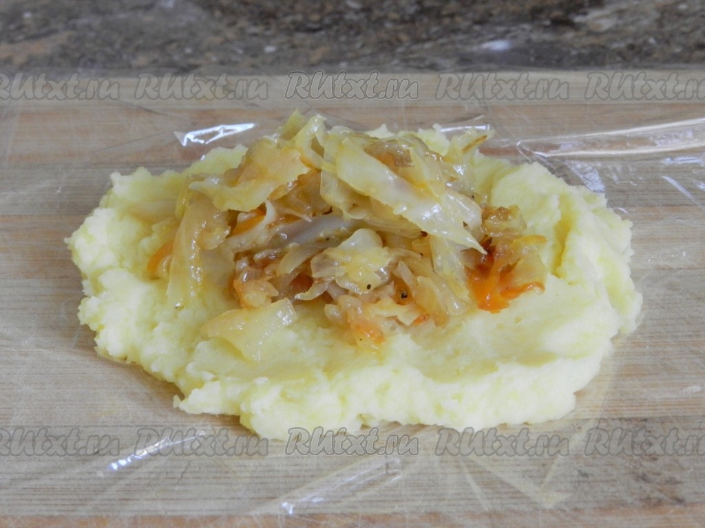 Разделить зрительно получившуюся картофельную массу на 7-8 частей. На столько же частей разделить остывшую капустную начинку. Зразы удобно формовать при помощи пищевой плёнки. Для этого на пищевую плёнку нужно выложить одну часть картофельной массы, сделать лепёшку, в середину выложить одну часть капустой начинки.