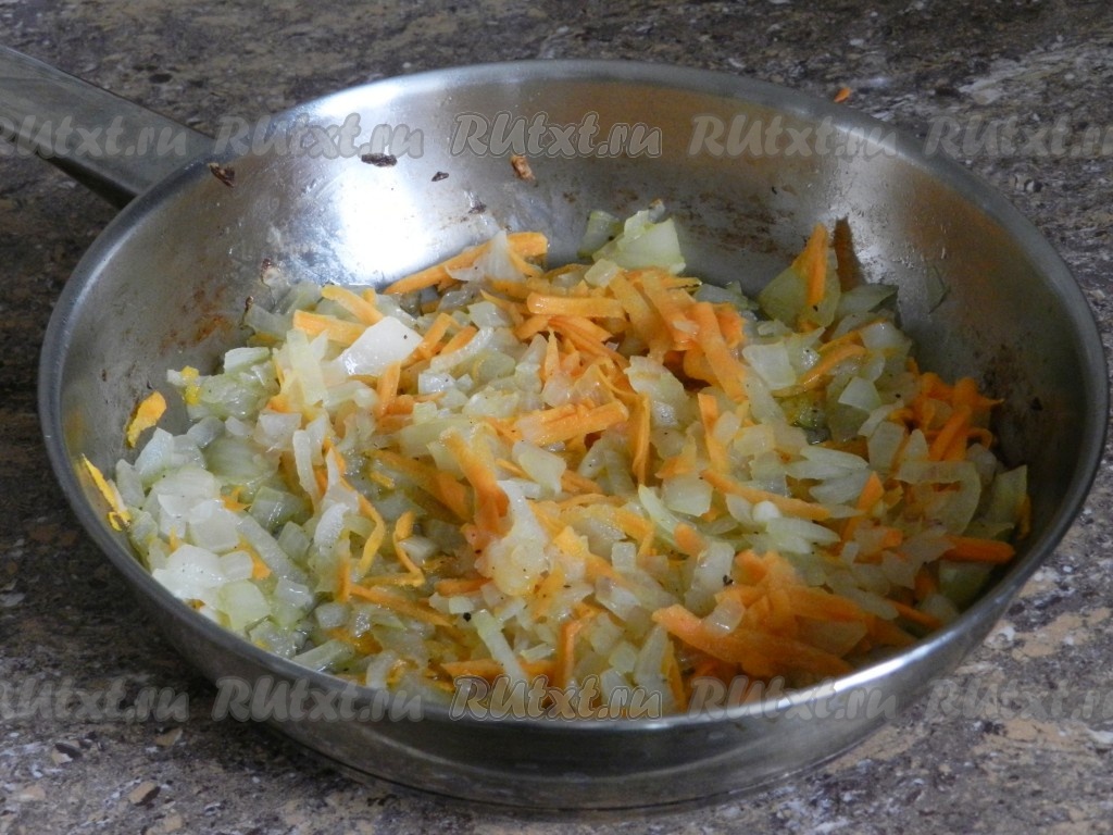 Очистить морковку и лук. В сковороде прогреть растительное масло, выложить морковь, натёртую на крупной тёрке, и мелко нарезанный лук, обжарить на среднем огне, периодически перемешивая, до мягкости моркови (ориентировочно в течение 7-8 минут).
