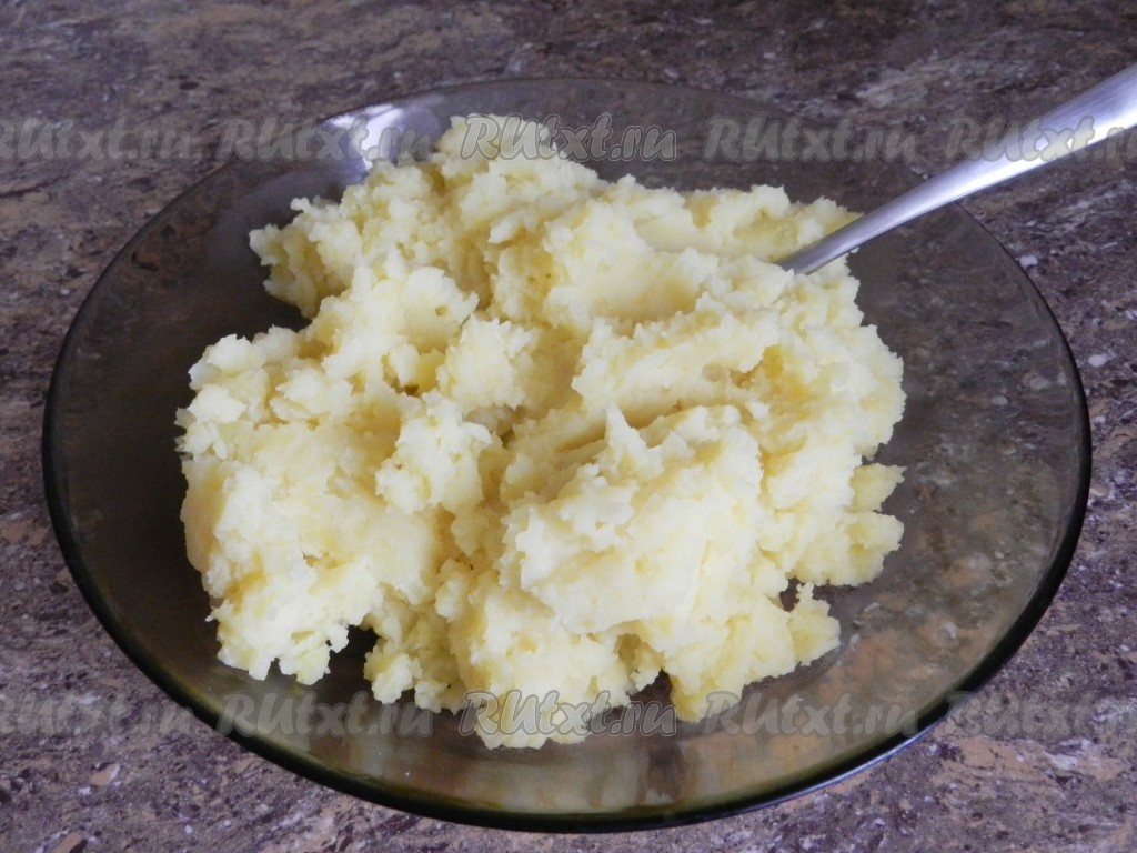 Картофель очистить, выложить в кастрюлю, залить полностью водой, поставить на огонь. После закипания воды, добавив соль, отварить картошку до готовности (ориентировочно в течение минут 25, готовые картошины должны легко прокалываться вилкой). Затем воду слить, размять картофель толкушкой до получения однородного пюре.