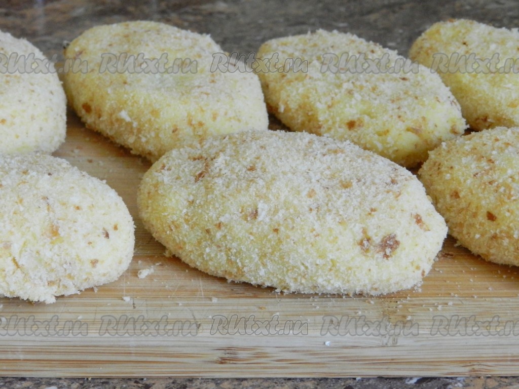 Сформированные зразы обвалять со всех сторон в панировочных сухарях (или в муке).