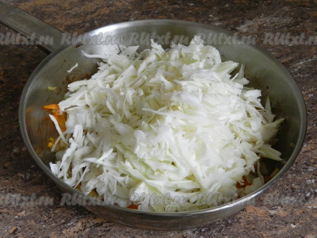К овощам, обжаренным до мягкости, добавить тонко нарезанную капусту, перемешать.