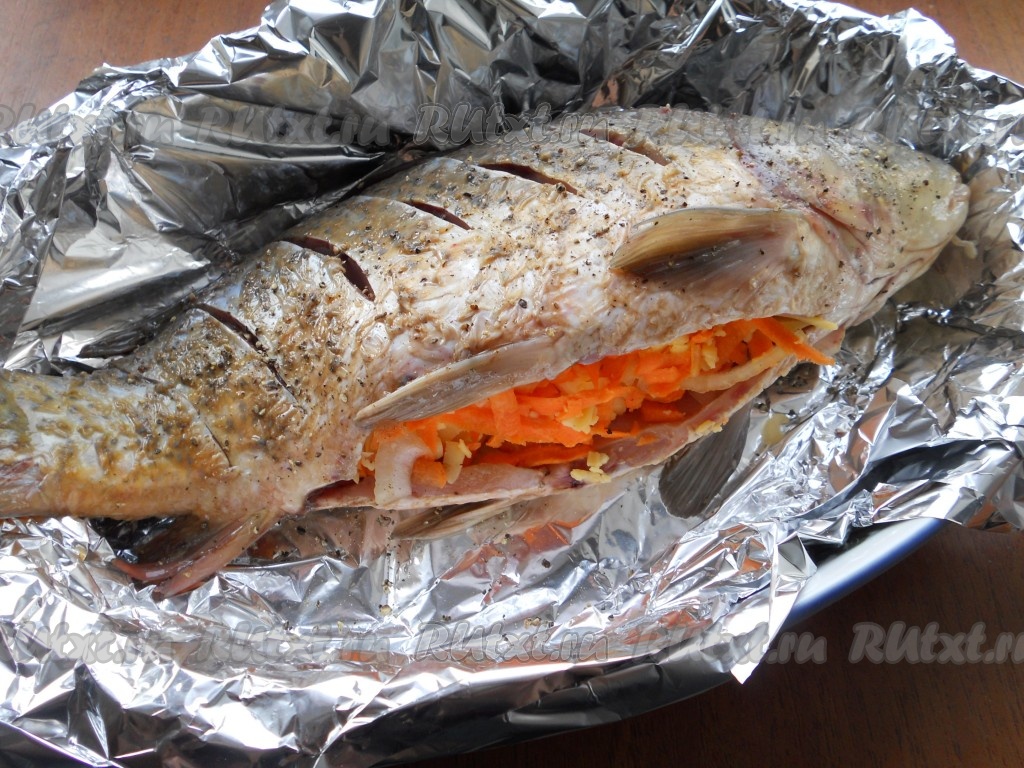 Накрыть форму листом фольги и поместить карпа в разогретую до 190-200 градусов духовку на 30-40 минут, после чего верхнюю фольгу убрать и запечь рыбу при той же температуре еще 10-15 минут.