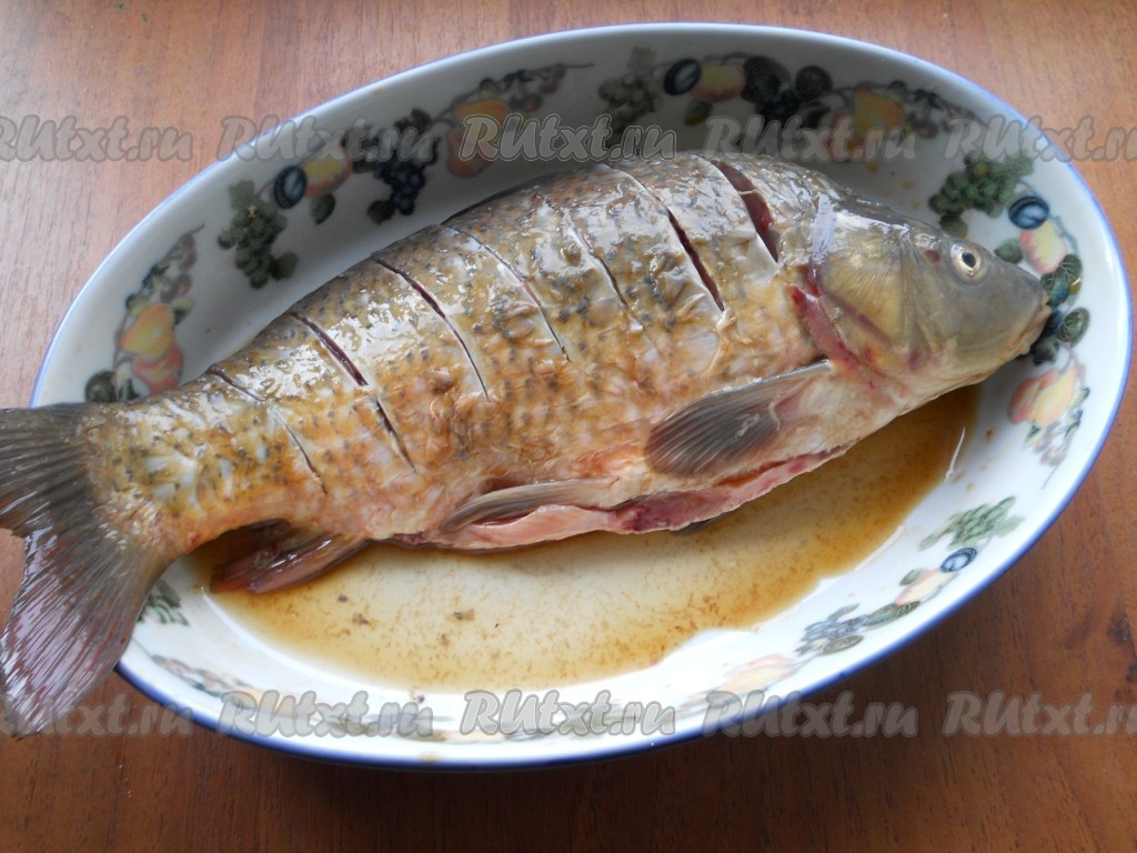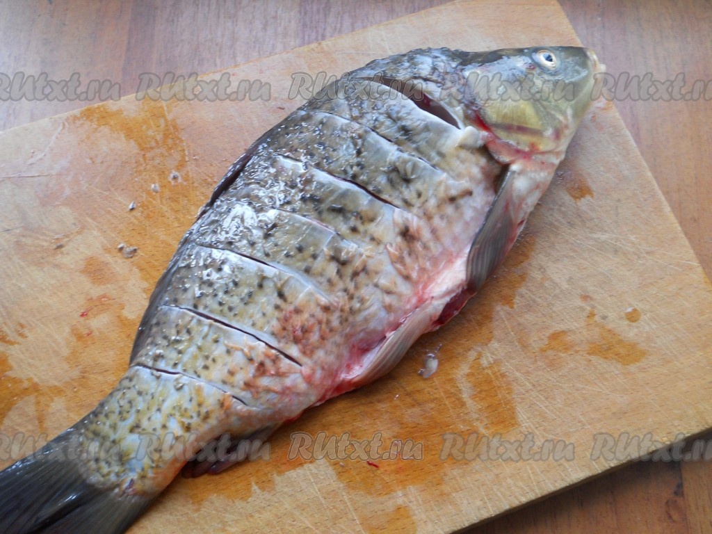 Карпа очистить от чешуи, удалить внутренности и жабры, хорошо вымыть. Сделать надрезы около хребта с двух сторон.
