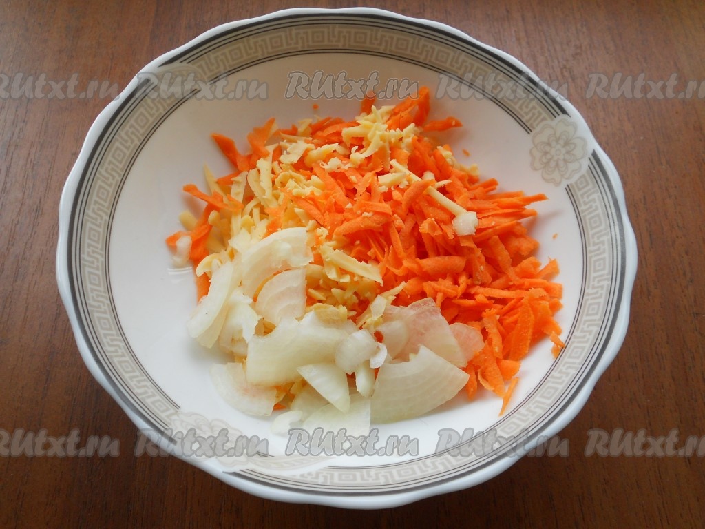 Сыр и морковь натереть на крупной терке, добавить нарезанный репчатый лук, перемешать.
