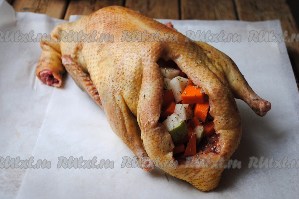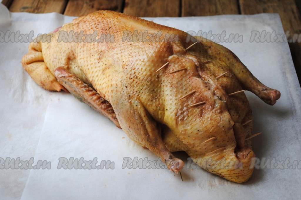 Чтобы начинка во время выпекания не выпала, нужно зашить или скрепить зубочистками брюшко утки.