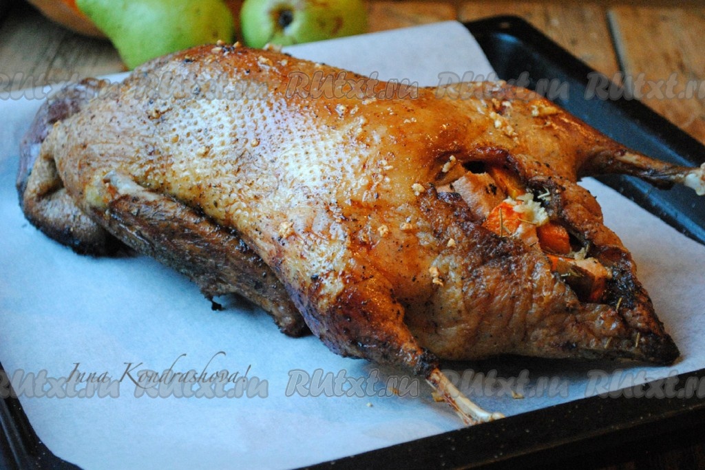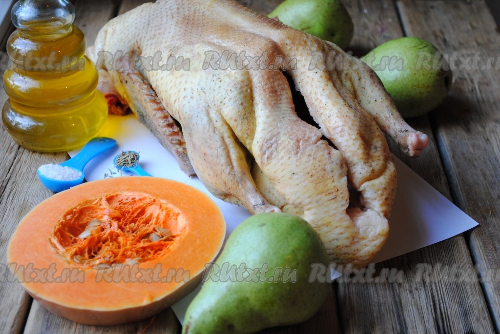 Утку промыть под холодной проточной водой, обсушить бумажным полотенцем. Утку внутри и снаружи хорошо натереть солью и перцем, взбрызнуть растительным маслом. Тыкву, очищенную от кожуры и семян, и груши нарезать средними кусочками, смешать с розмарином и хорошо перемешать получившуюся начинку.