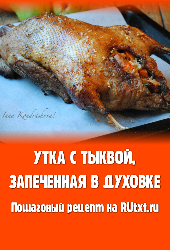 Запекать утку с тыквой в разогретой до 180 градусов духовке 1,5-2 часа, периодически поливая её выделившимся соком. За 5 минут до готовности выдавить на утку чеснок и с помощью ложки растереть его по всей поверхности. Утку достать из духовки и проверить на готовность, из готовой утки, при прокаливании бедрышек, будет вытекать прозрачный сок, а нож будет легко и мягко входить в мясо.