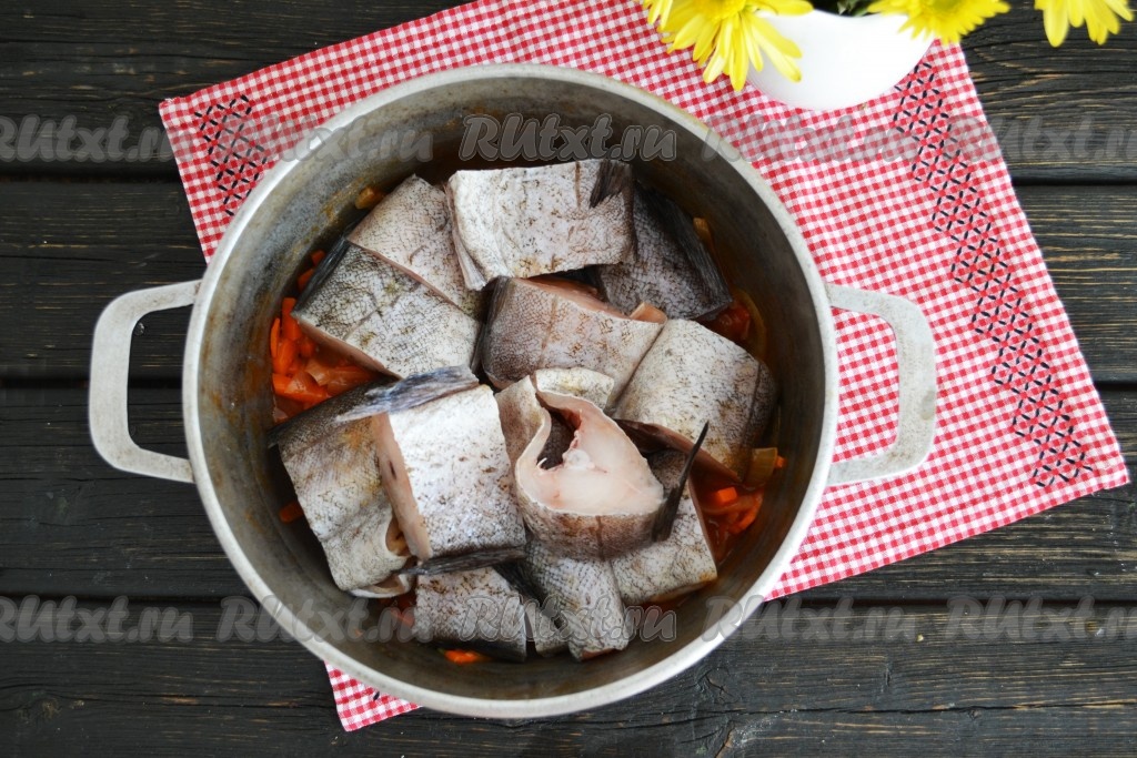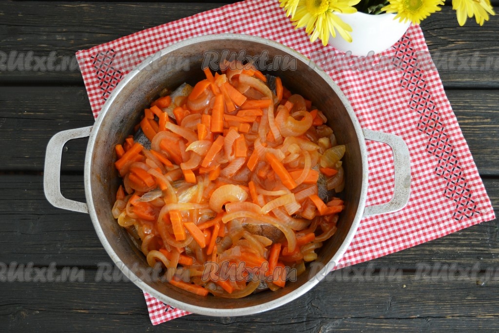 Сверху выложить овощи, которые откладывали. Влить воду, накрыть крышкой и тушить минтая с морковью и луком на самом слабом огне 30-35 минут.