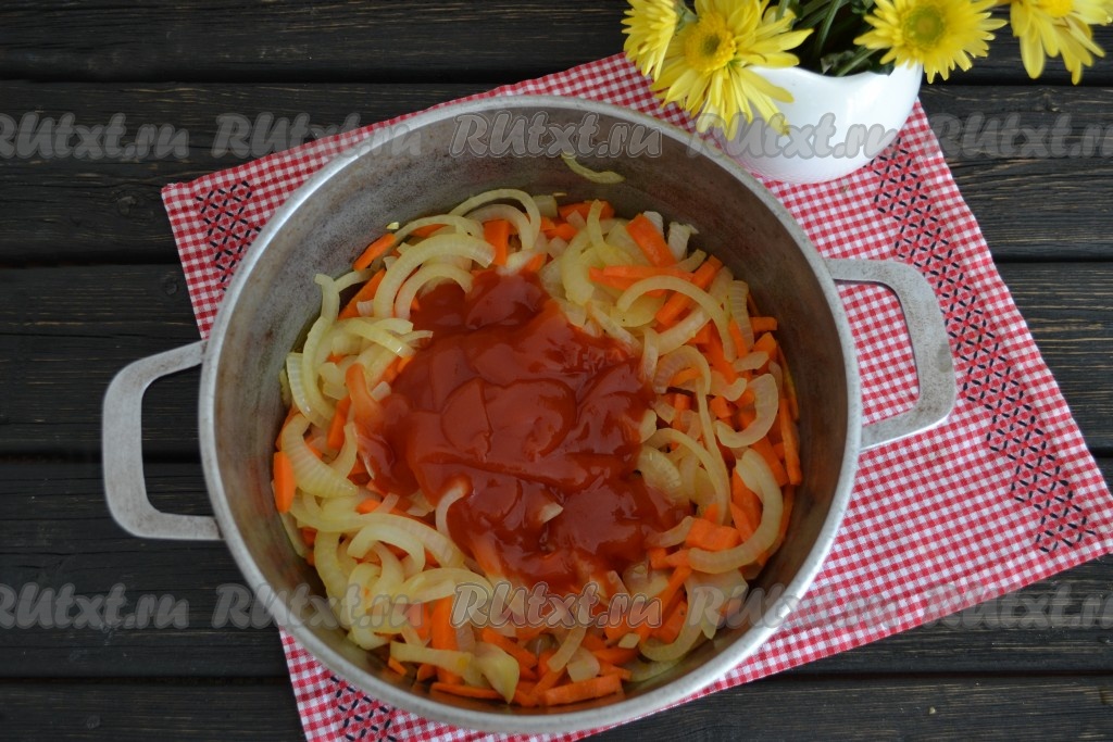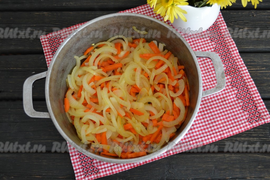 В казан, сковороду или толстостенную кастрюлю влить растительное масло и прогреть его 1 минуту. Всыпать морковь с луком и обжарить их 2-3 минуты, иногда помешивая, до прозрачности лука.