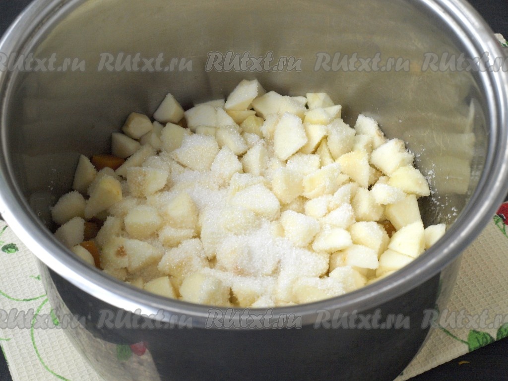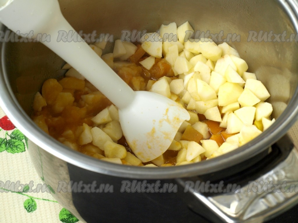 Спустя отведённое время, в кастрюлю с тыквой засыпать яблоки и сахар. Слишком сладким пюре делать не стоит, достаточно будет 80-100 грамм. Снова поставить кастрюлю на огонь и варить ещё 10-12 минут.