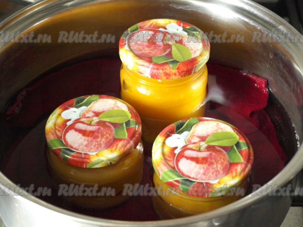 Подготовить заранее простерилизованные банки и крышки. Разложить в них горячее тыквенно-яблочное пюре. В широкую кастрюлю положить на дно полотенце, поставить на него баночки, прикрыть банки крышками и налить "до плечиков" горячую воду. С момента закипания стерилизовать пюре 15 минут.