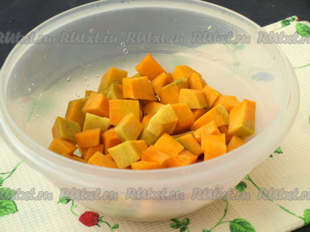 Средними кусочками нарезать тыкву.