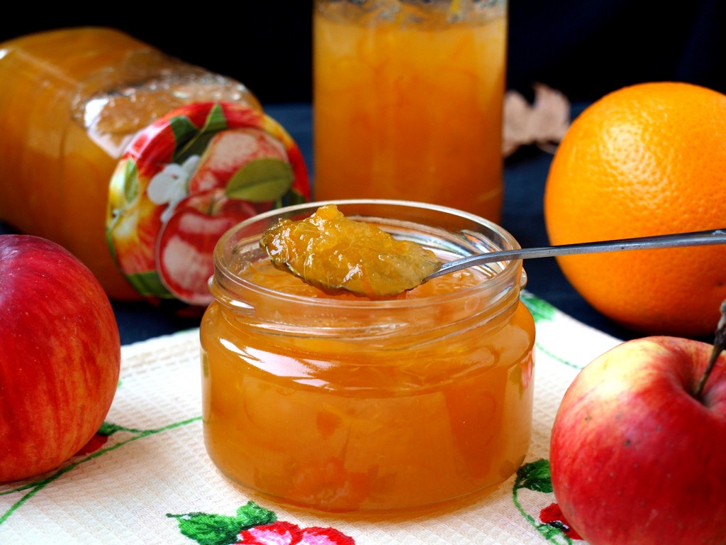 Яблочно-апельсиновый джем - вкусное лакомство, которое актуально приготовить осенью, когда много яблок, а в магазинах появляются хорошие, сочные апельсины. Спектр применения джема огромен: его можно просто подать к чаю, использовать для выпечки, поливать блинчики и оладьи и т.д. Из указанного количества ингредиентов получится 900 мл чудесного джема.