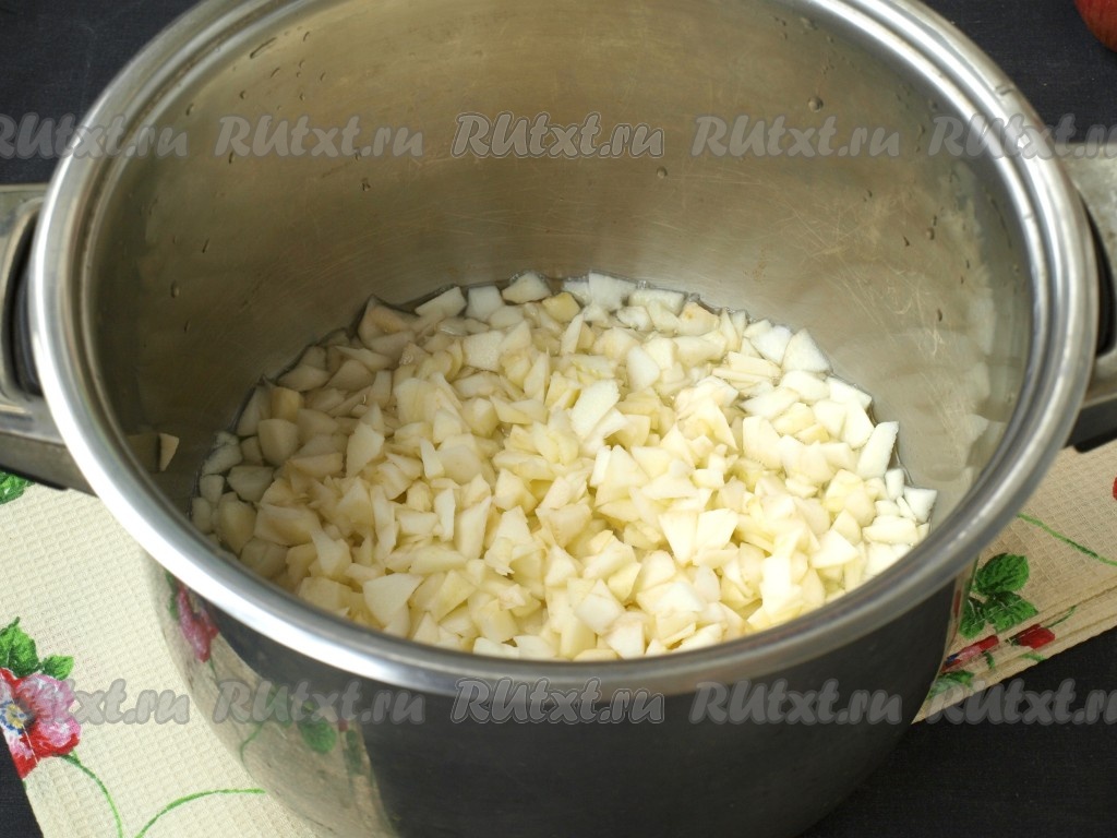 Яблоки мелко нарезаем, складываем в кастрюлю, наливаем воду. Ставим кастрюлю на огонь, накрываем крышкой и варим на небольшом огне 20-25 минут (до мягкости яблок).