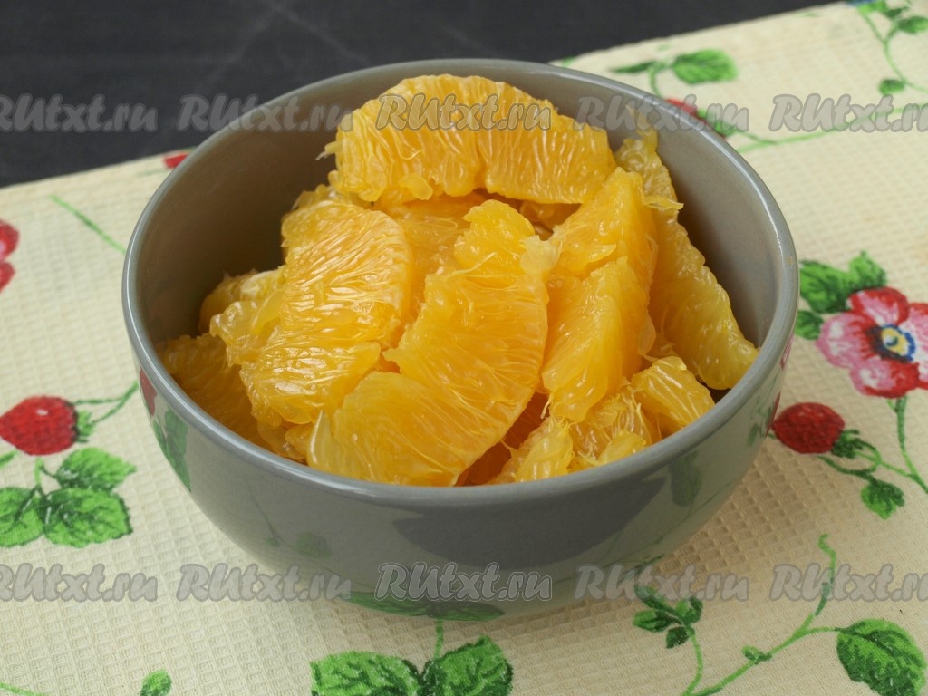 Затем апельсины разделяем на дольки, очищаем от плёночек и косточек.
