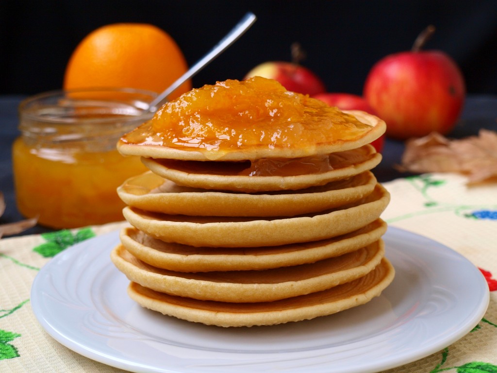 Складывать горочкой на тарелку. Подавать наивкуснейшие панкейки, замешанные на воде, с джемом, мёдом, вареньем. У меня сегодня с яблочно-апельсиновым джемом.