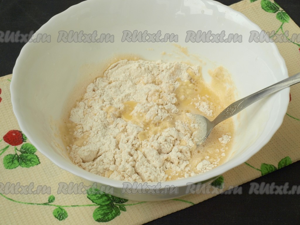 Добавить в получившуюся смесь просеянную муку вместе с разрыхлителем, а также соль и ванильный сахар, хорошо перемешать тесто ложкой.